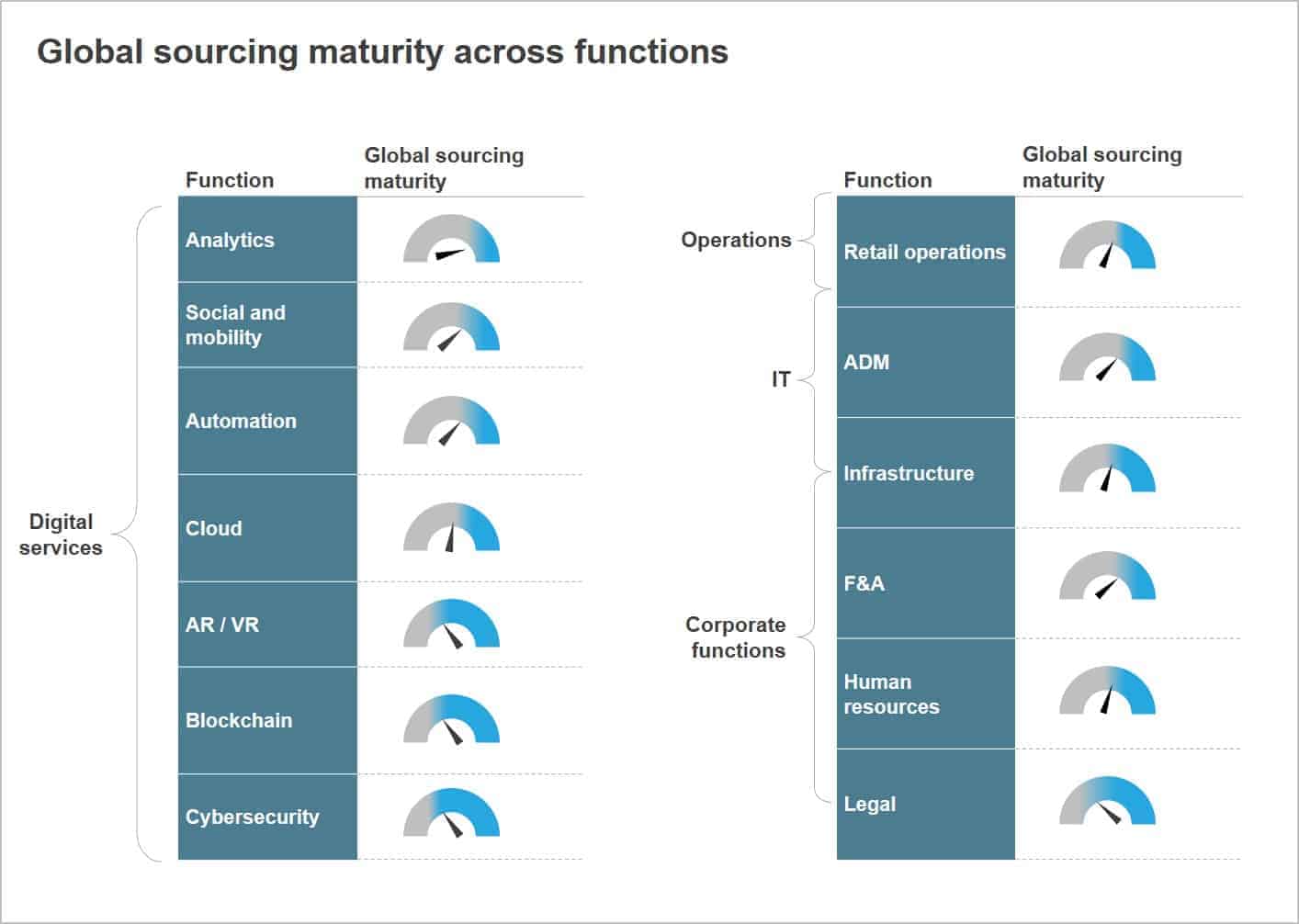 As part of this transformation, retail and CPG firms are evolving their sourcing strategy for: industry-specific processes including sourcing and procurement, merchandising and inventory management operations, sales and marketing, and customer experience; and horizontal processes like IT services, digital services, compliance and quality, and corporate functions such as F&A, contact center, and HR.