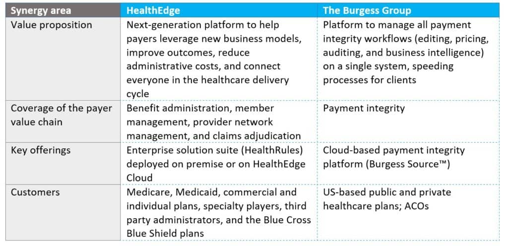 HealthEdge provides an integrated financial, administrative, and clinical software platform (the HealthRules suite), while The Burgess Group is a specialist in the payment integrity software space.