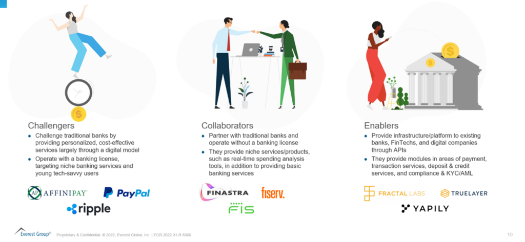 As illustrated below, the FinTech ecosystem has morphed into three distinct categories: challengers (direct competitors that have built digital-only banks and financial institutions), collaborators (partners with traditional banks to leverage open APIs), and enablers (infrastructure and platform support providers):