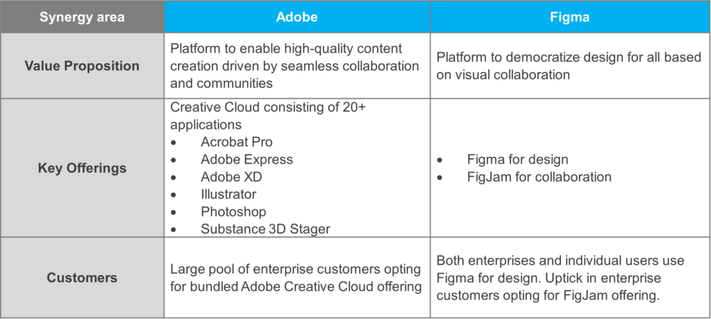 • Coverage of end-to-end functionality in design lifecycle: Figma’s special focus on the brainstorming and whiteboarding phase of the design lifecycle with the launch of FigJam will add to Adobe’s capabilities to address product ideation activities. Figma’s offerings will augment Adobe’s design capabilities as well