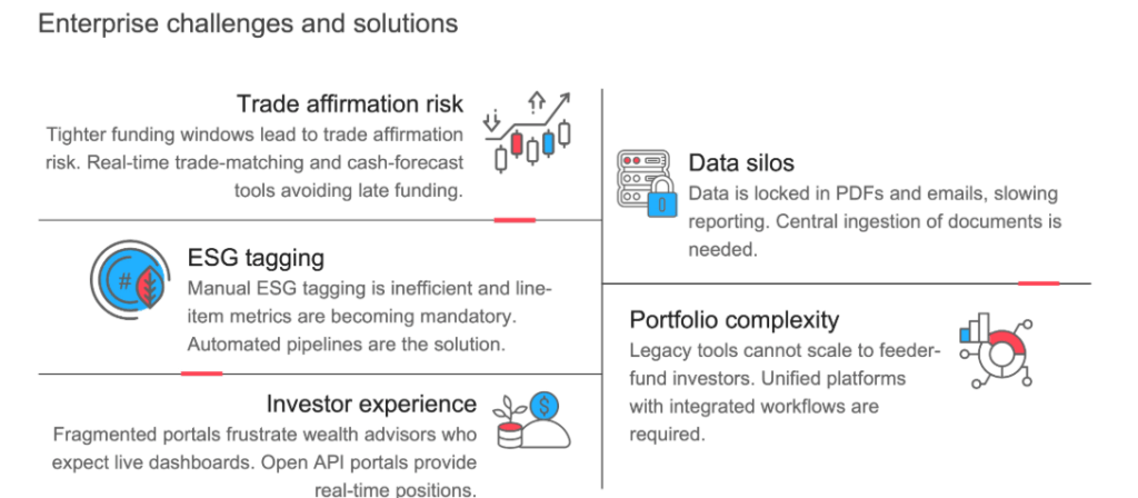 Sustainability metrics must now be captured at a line-item level as supervisors increase their reviews of environmental and social disclosures. These issues recur for GPs, LPs, fund administrators, and custodians, with their severity varying by operating maturity and regulatory footprint. Common threads include manual document handling, fragmented data, and rising disclosure expectations that raise both operational load and time-to-report.