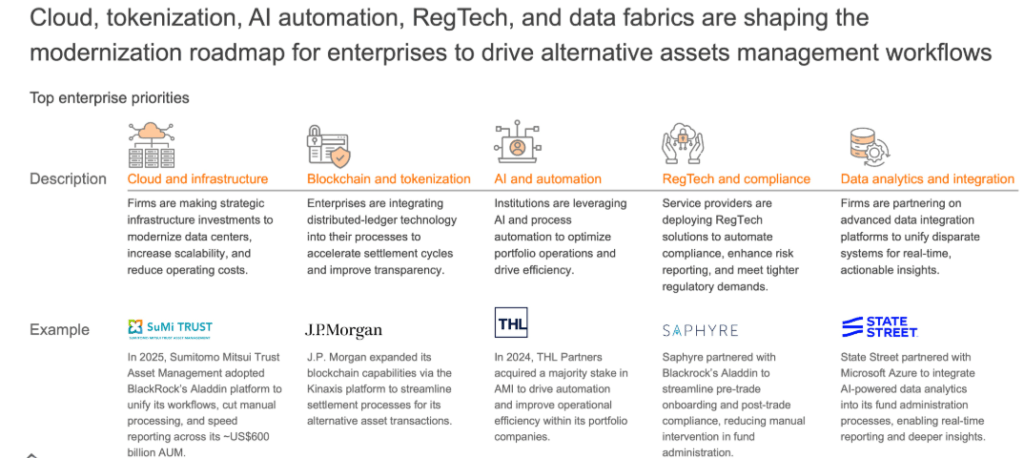 Asset owners are looking to consolidate legacy systems into a single cloud platform to cut manual hand-offs, while banks are extending their distributed ledger capabilities to accelerate settlement in alternative transactions