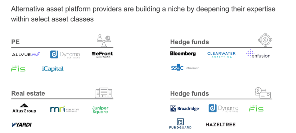 Platform capabilities vary based on the unique requirements of different asset classes. Platforms focused on private equity differ from those built for hedge funds or private credit. Service buyers therefore curate multi-provider stacks that combine best-in-class functionality with domain expertise. The landscape below illustrates how solutions cluster around specific strategies.