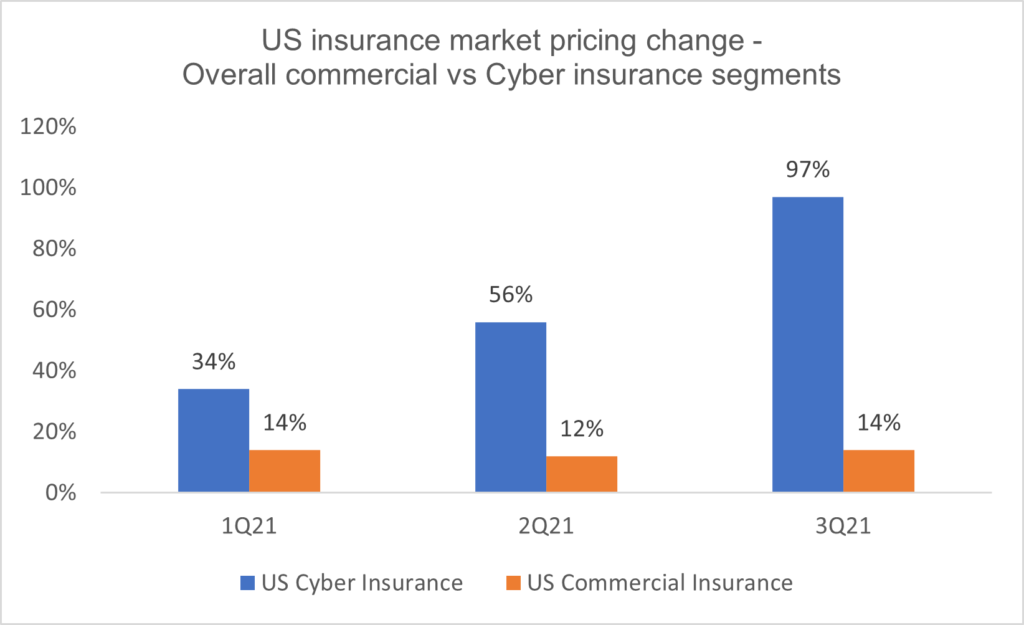 All of these factors have led to a substantial increase in cyber insurance pricing across the world. An analysis by Marsh shows US cyber insurance pricing increased 96% year-over-year during the third quarter of 2021, which also represented a 40 percentage point increase from the second quarter of the year.