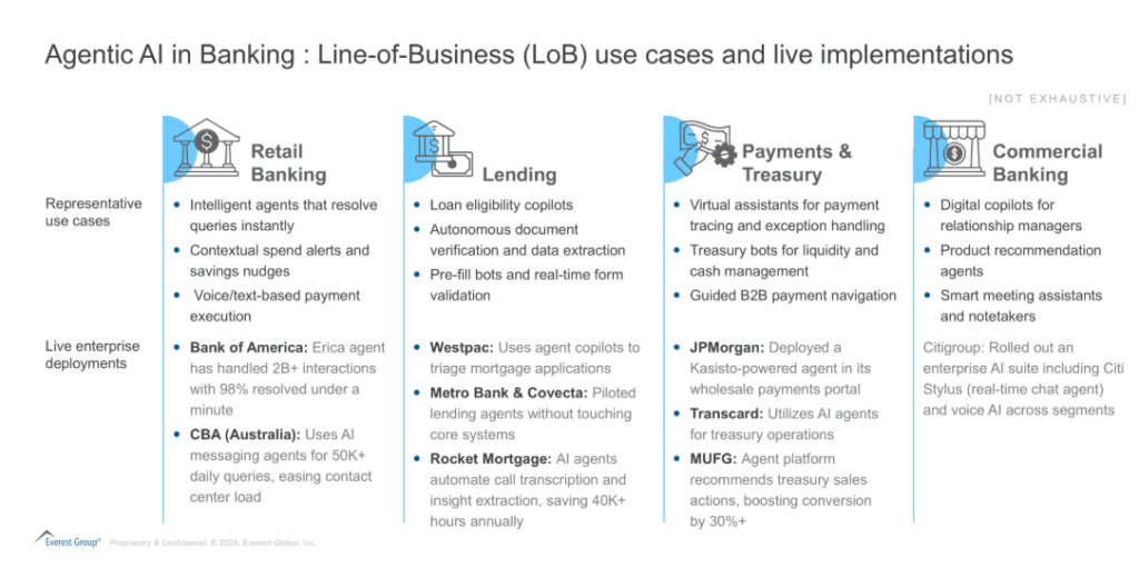 Agentic AI is no longer a possibility but is actively reshaping the operational strategy of global banks. At JPMorgan Chase, a generative AI (gen AI) assistant is being rolled out to over 140,000 employees with the goal of unlocking more than US$1.5 billion in productivity and risk-related value. Wells Fargo’s virtual assistant, Fargo, has already completed over 200 million fully autonomous customer interactions. These are live, enterprise-scale deployments redefining how decisions are made.