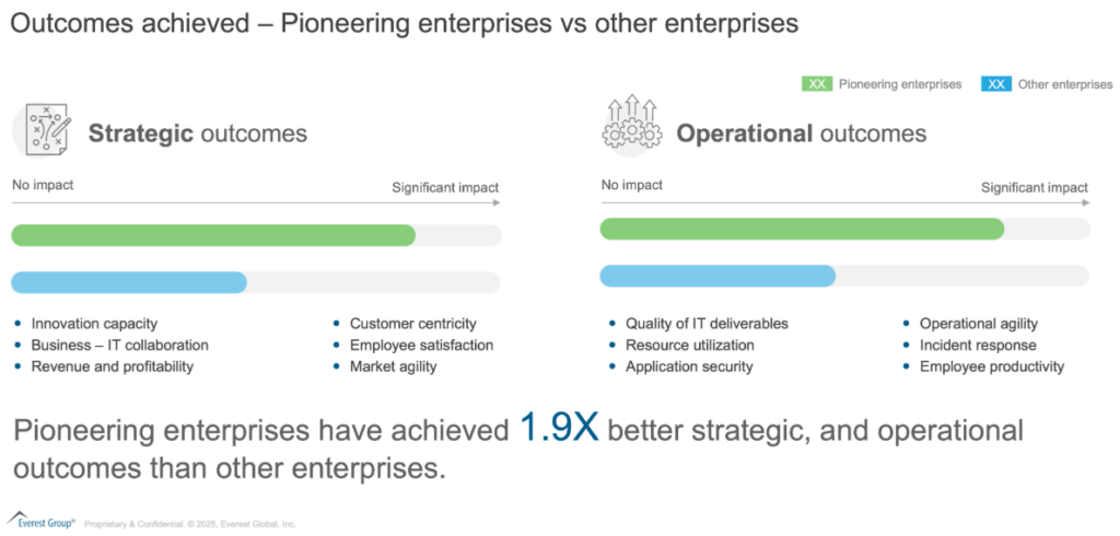 Beyond the strategic wins, these organizations have revolutionized their operational capabilities. On the operational front, pioneering enterprises have achieved a 1.75X better performance in areas such as IT deliverable quality, resource utilization, application security, and operational agility.
