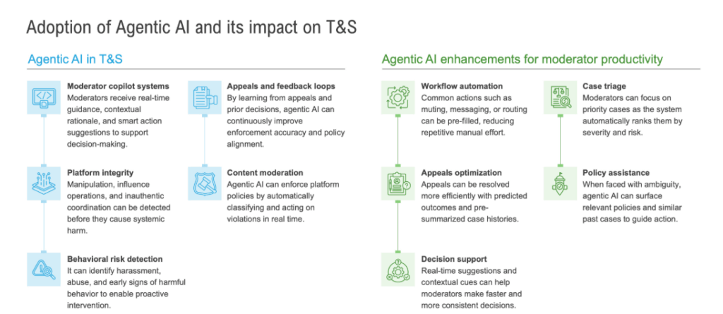 Agentic AI doesn’t just accelerate operations, it reshapes how enterprises must think about T&S. Traditional models based on static moderation and after-the-fact review are no longer sufficient in systems capable of independent action.