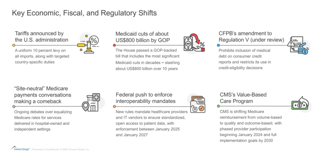 Though the focus of tariffs has been on goods, they will inevitably have a trickle-down effect on the service sector. Tariffs coupled with evolving fiscal decisions such as Medicaid cuts and some proposed regulatory changes such as the Consumer Financial Protection Bureau (CFPB)’s amendment to Regulation V (under review) and CMS’s push for Value-Based Care (VBC), among others, will have a profound impact on healthcare providers’ financial and cash flow position. Let’s understand how!