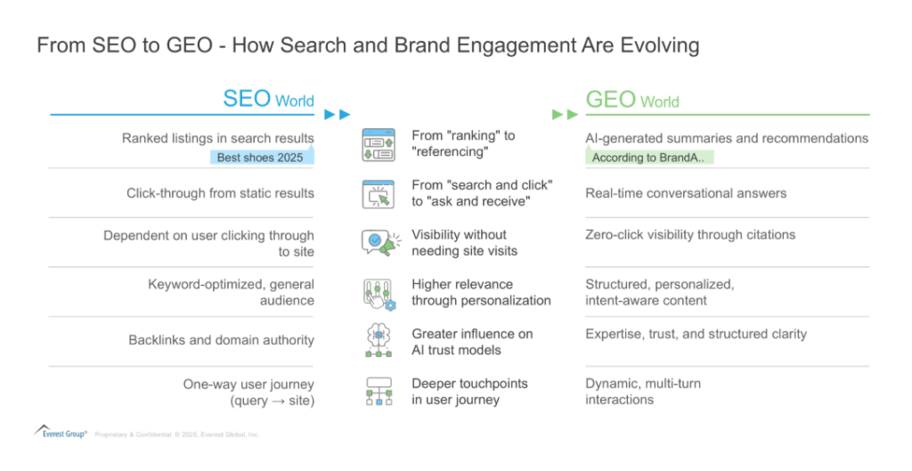Exhibit 1 is a visual framework of the evolution from SEO to GEO.
