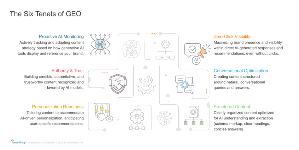 Its central tenets include conversational optimization, structured content, authority and trust  , zero-click visibility, personalization readiness, and proactive AI monitoring, equipping brands to thrive in a digital landscape increasingly mediated by gen AI, conversational interfaces, and personalized experiences.