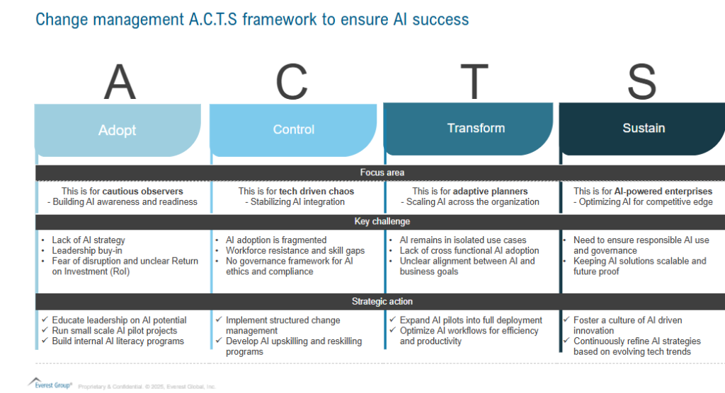 Enterprises that embrace structured change management, such as the A.C.T.S. framework, can mitigate risks, ensure workforce alignment, and create long-term value from AI adoption. The question is no longer whether AI will disrupt industries, but which organizations will harness it effectively and lead the transformation.