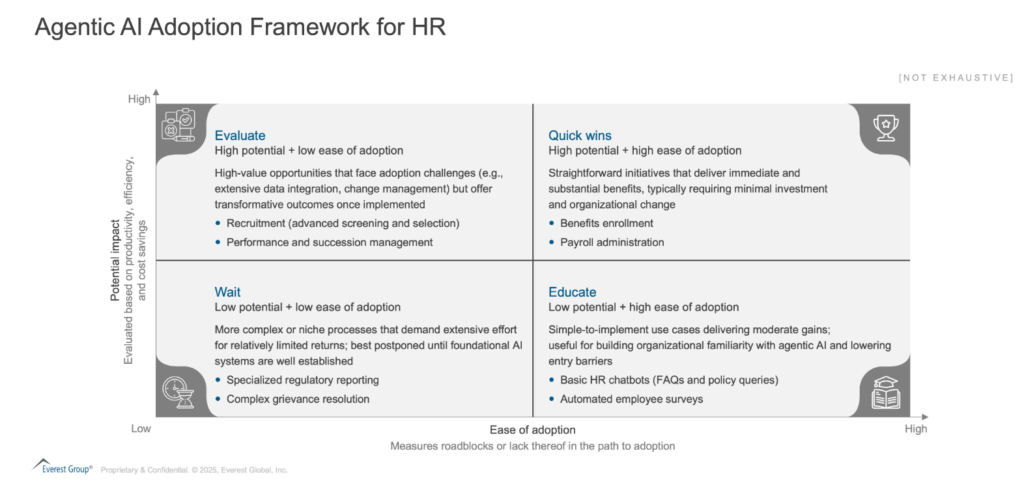Although Agentic AI is quickly gaining attention, its adoption in HR remains relatively early. The most promising initial applications focus on transactional tasks, particularly those involving high-volume, rules-based processes. According to Everest Group’s HR Outsourcing (HRO) process map, three areas are especially well-suited as entry points, these are as follows: