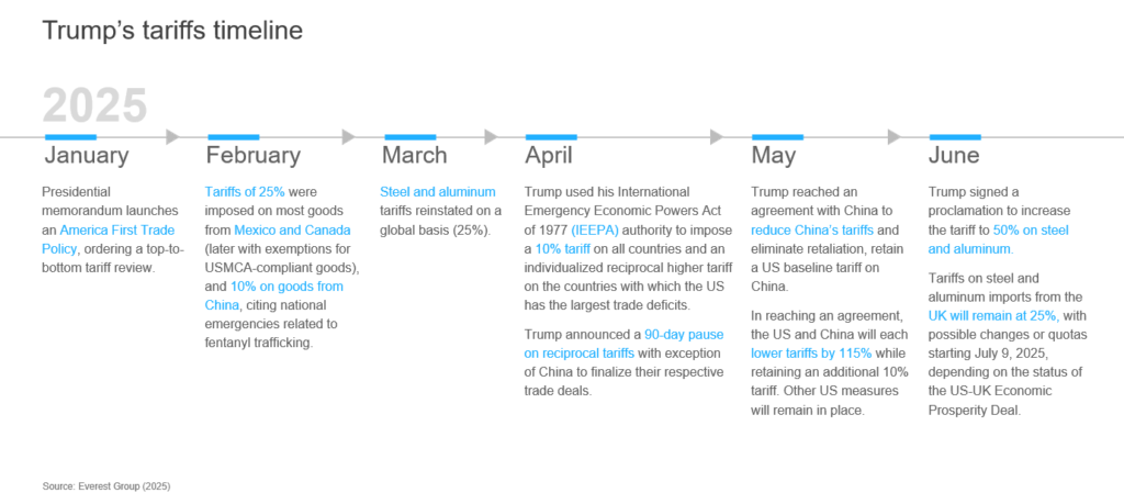 For more information regarding the US administration’s tariffs and to see what the US tariffs mean for the global services market, please visit https://www.everestgrp.com/us-administrations-tariffs/ .