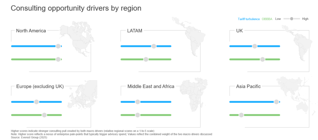 • North America: Strongly impacted due to the direct origin of both policies. Enterprises are aggressively navigating tariffs and OBBBA-driven fiscal shifts, fueling robust demand for tax strategy and supply chain realignments.
