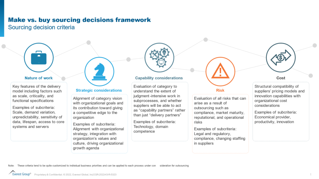 To make more objective, informed decisions, use a proven approach like the Make vs. Buy Sourcing Decisions Framework, a core component of Everest Group’s sourcing methodology. This framework enables organizations to decide whether to deliver services in-house, engage external vendors, or adopt a mix of both.