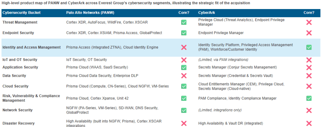Until now, one reason PANW couldn’t truly challenge E5 was its lack of a full-fledged identity platform. With CyberArk (plus Idaptive’s Identity Provider and Zilla’s IGA) now under the PANW umbrella, that gap just closed. PANW is suddenly one of the very few providers, apart from Microsoft and perhaps Okta/Thoma Bravo portfolios, to offer all foundational Identity and Access Management capabilities (AM, PAM, and IGA) on top of its world-beating threat detection, response, and SASE stack.
