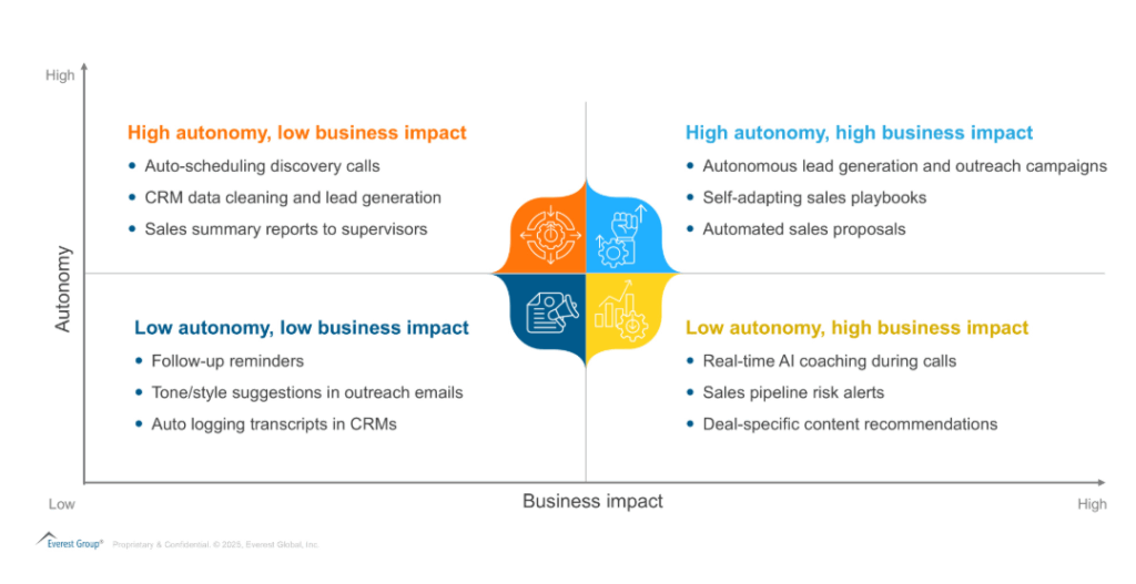 As agentic AI continues to transform sales operations, understanding where and how intelligent AI agents can deliver the greatest value becomes essential. Not all applications of agentic AI carry the same weight, some enhance operational efficiency with limited business impact, while others drive strategic outcomes with greater autonomy. The matrix below categorizes key use cases of agentic AI in sales along two dimensions: autonomy and business impact. This visual helps illustrate how AI tools are expanding from simple task automation to fully autonomous AI agents capable of generating tangible sales outcomes.