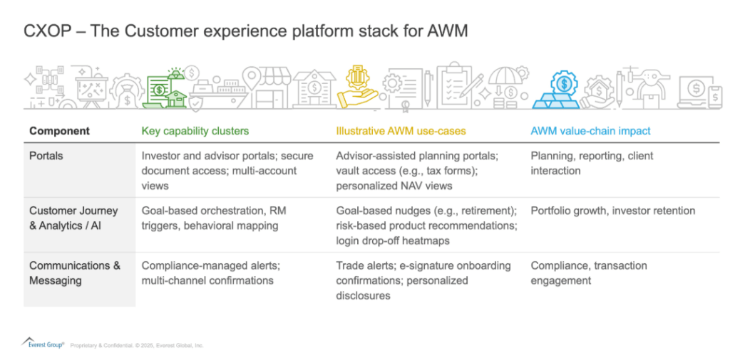 As digital maturity deepens, banks and AWM firms are evolving from managing disconnected channels to orchestrating unified, real-time journeys, stitching together interactions across personas, products, and platforms. This shift is redefining what leading experience infrastructure looks like: composable, insight-led, and outcome-driven.