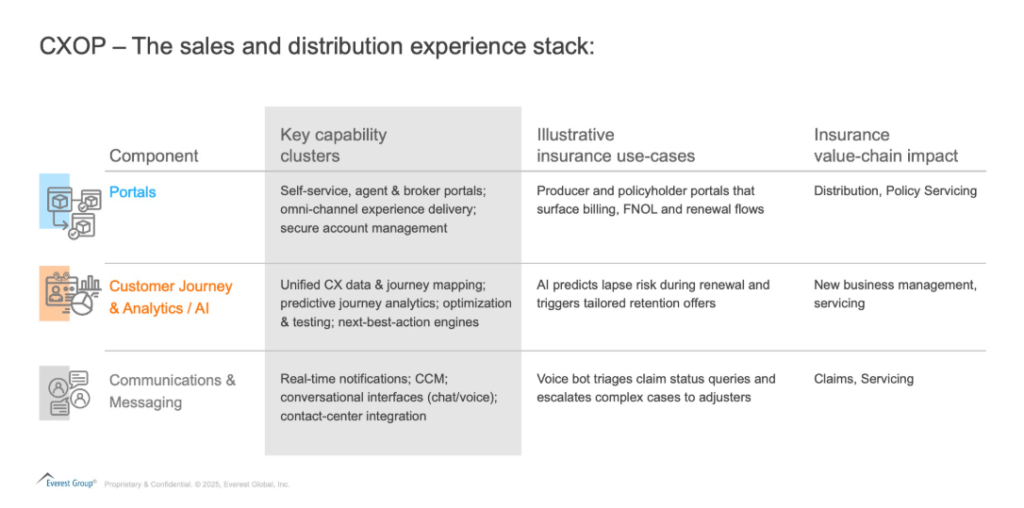 The experience platform market in insurance is comprised of two product stacks: a Customer Experience Orchestration Products (CXOP) layer that powers sales and distribution journeys, and a Marketing Technology (MarTech) layer that fuels data-driven growth marketing.