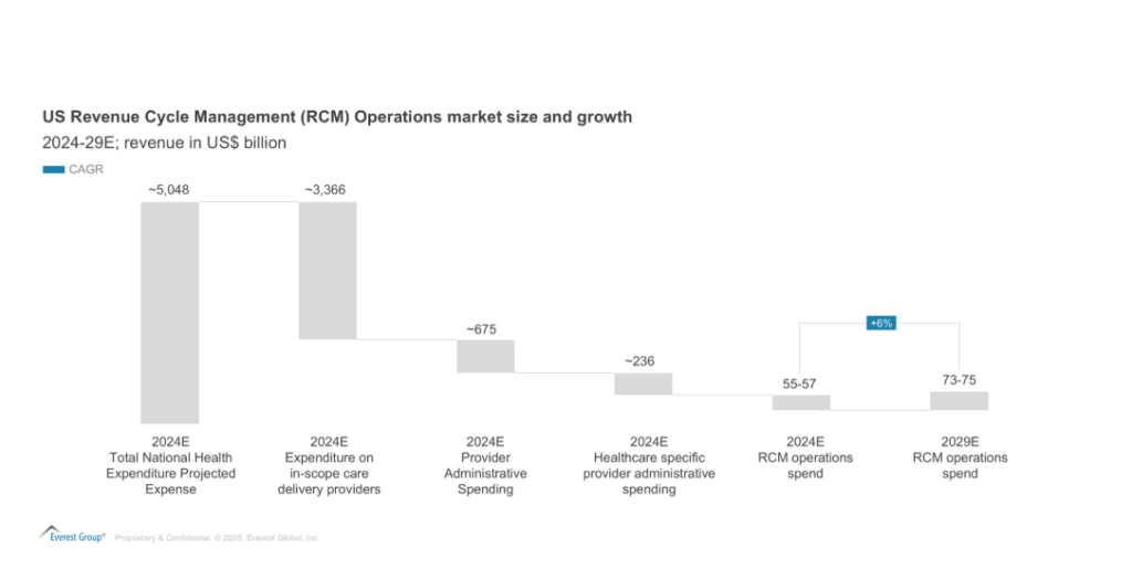 Based on Everest Group’s assessment of the demand and supply side, the RCM operations spending in the US stood at approximately US$55-57 billion in 2024 and is expected to reach US$73-75B by 2029.