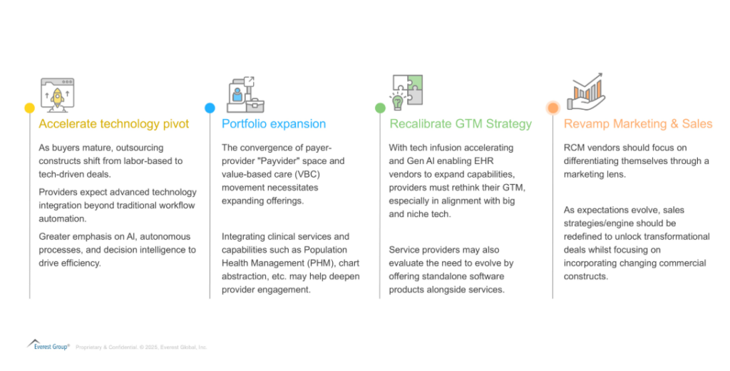 While traditionally RCM vendors, particularly offshore RCM vendors, fueled growth by streamlining administrative tasks and leveraging labor arbitrage opportunities through offshore operations and streamlined workflows. However, as healthcare evolves, these strategies alone are no longer enough to sustain competitive advantage. To unlock the next era of growth, RCM vendors should focus on: