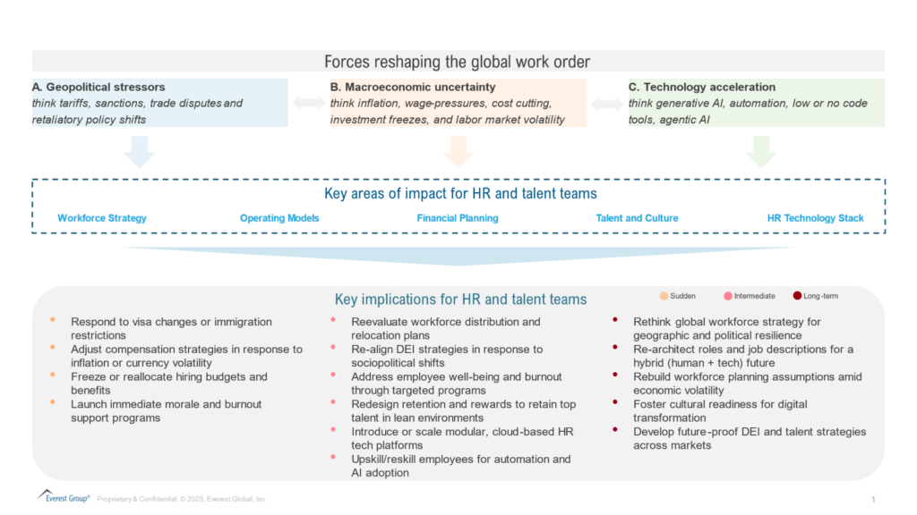- Geopolitical volatility (from war and trade policies to immigration reform): forces HR to rethink workforce models, local labor laws, and Diversity, Equity and Inclusion (DEI) strategies