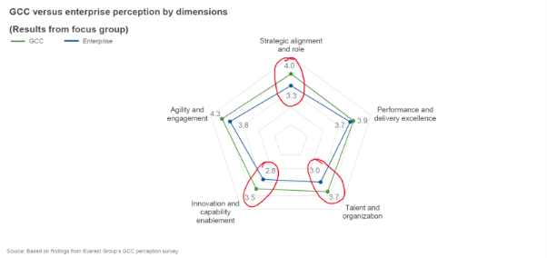The chart below tells the story, enterprise perception of GCC value consistently trails GCC self-perception across strategic alignment, talent, innovation, and agility. That gap? It’s not about missing dashboards. It’s about missing trust, alignment, and shared understanding.