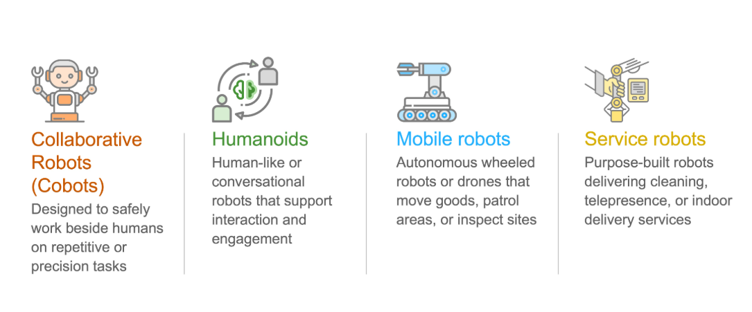 | Industry | Cobots | Humanoids | Mobile robots | Service robots |