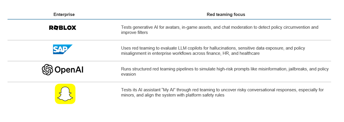 Many leading organizations are already using red teaming not just as a one-off risk assessment, but as a core component of their T&S strategy. Whether testing for policy violations, misuse scenarios, or emerging forms of AI abuse, red teaming is becoming deeply integrated into how enterprises design, test, and monitor AI systems. The table below highlights how different companies are applying red teaming to support safer and more trustworthy AI deployments.
