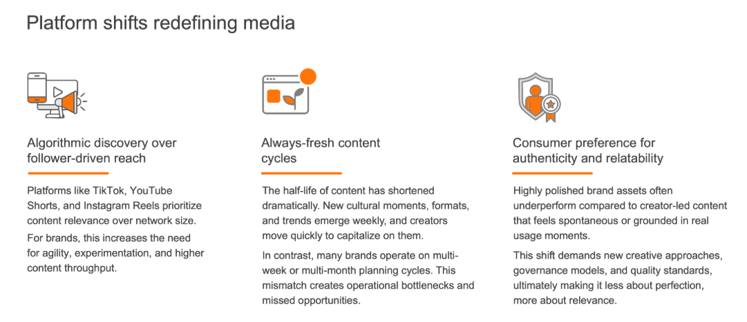 Integrating influencer activity into formal media operations across planning, production, governance, and measurement remains a significant challenge for many enterprises. As media platforms continue to evolve rapidly, this operational gap is becoming harder to manage. The need for modernization is being driven by three critical platform-level shifts, which Exhibit 1 illustrates.