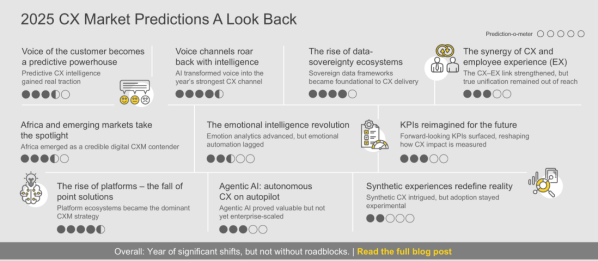 When we made these predictions at the start of 2025, we expected acceleration and the year delivered. Many of the 10 bets delivered: AI-driven voice, platform consolidation, data sovereignty, and agentic automation, all moved significantly from vision into reality. Others such as predictive customer twins, Emotional-Intelligence-as-a-Service, unified EX-CX measurement, and immersive synthetic CX showed good progress but need more time.