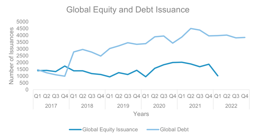 Watching global capital markets over the past few years has been a rollercoaster ride of issuances and investments. Concerns of market volatility and issuances softening started way before the recent collapse of global banking giants, Silicon Valley Bank (SVB) and Credit Suisse. As illustrated below, overall global equity issuance was stagnant from 2017-2019, while global debt issuance has been steadily rising since 2017.