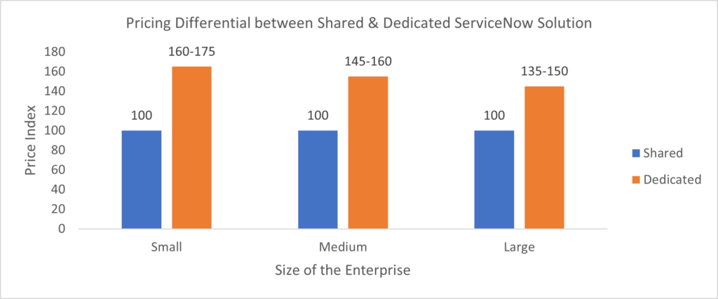 Even though the shared instance model can cost 35-75% less (as shown below) based on our research, price should not be the only consideration when implementing a ServiceNow solution. Enterprises should consider all the parameters discussed and take a holistic view.