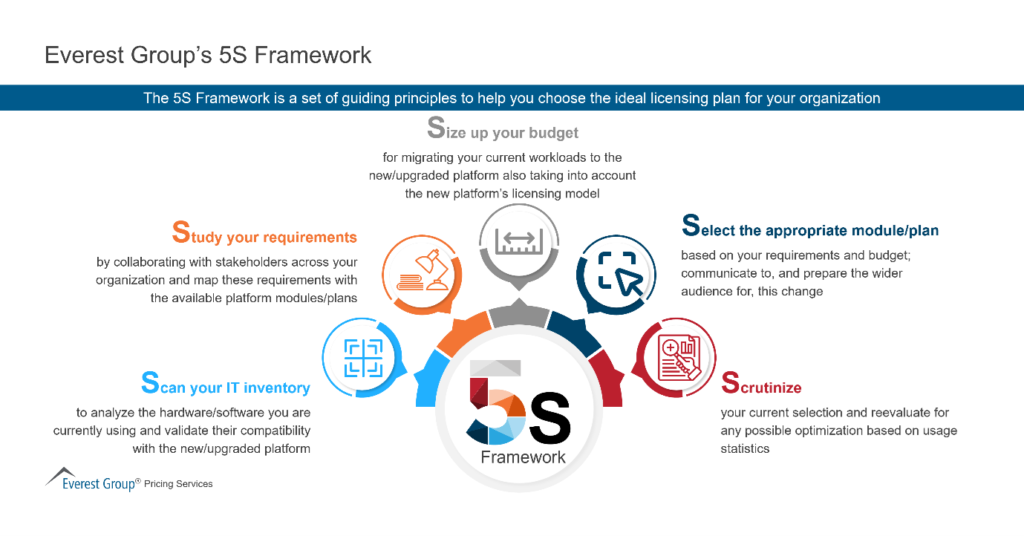 Selecting the right Microsoft Office 365 licensing plan is a critical decision for organizations that can lead to greater cost savings, negotiating power, and flexibility. Read on to discover how Everest Group’s 5S Framework can make this complicated task easier and see our expert analysis comparing the various license plans to make the best choice.
