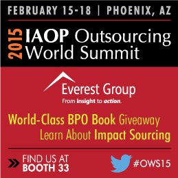 Join us at the 2015 Outsourcing World Summit to learn more about the business and social benefits of impact sourcing and how you can integrate impact sourcing into your service delivery portfolio. We will present findings of the research based on 60+ in-depth interviews with organizations that are currently utilizing impact sourcing.