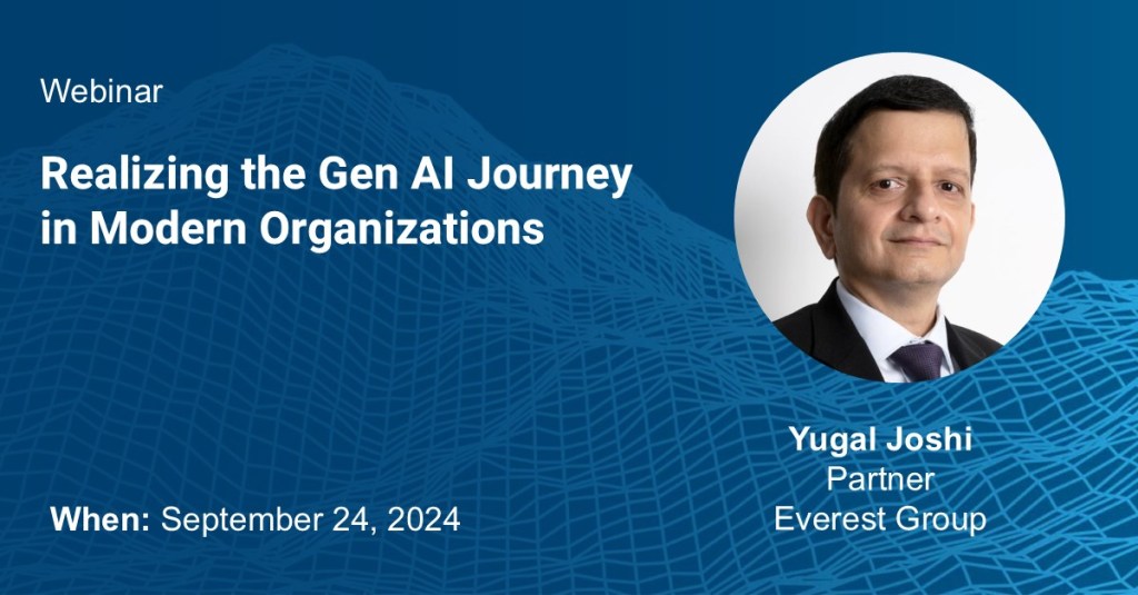 Join Everest Group Partner Yugal Joshi for a webinar titled Realizing the Gen AI Journey in Modern Organizations where he’ll feature in a panel of experts to explore the latest trends in generative AI adoption and uncover unique strategies to achieve scalable AI success.