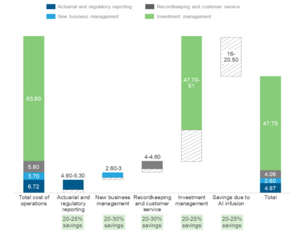 Our analysis estimates that AI infusion can unlock between US$16–20 billion in cost savings across the U.S. retirement and pension industry over the next few years. These savings stem from automation, predictive analytics, and modernization of recordkeeping and investment systems.