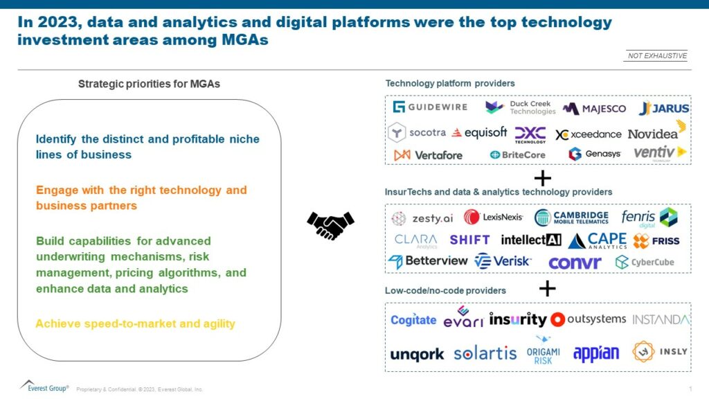 Let’s take a look at the key strategic priorities for MGAs and an illustrative provider landscape in the exhibit below: