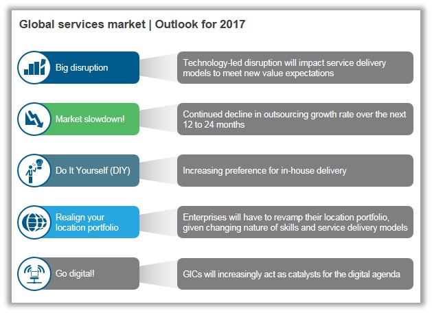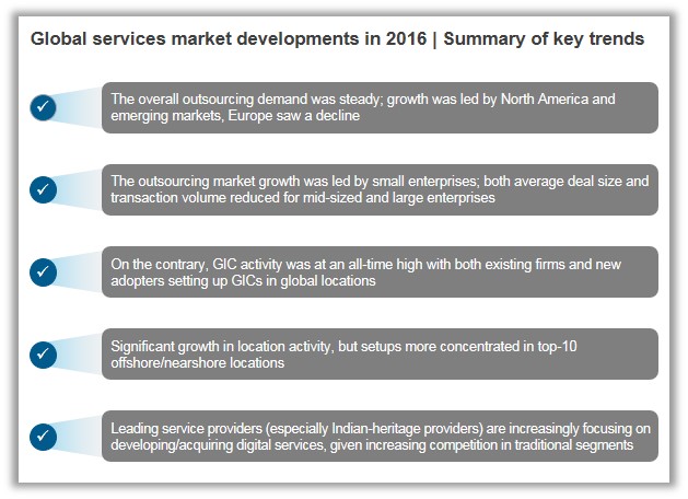 Market Vista – 2016 Year in Review report gives an overview of the developments that took place in the global services industry in 2016. The report highlights key trends and drivers pertaining to GICs, offshore/nearshore locations, service providers, and outsourcing transactions. Besides providing an outlook for 2017, the report highlights implications for market participants as well. The objective is to help buyers, analyst communities, experts, and business executives to assess sourcing market developments from service providers’ and buyers’ point of view, which can help them frame their opinion and take timely decisions.