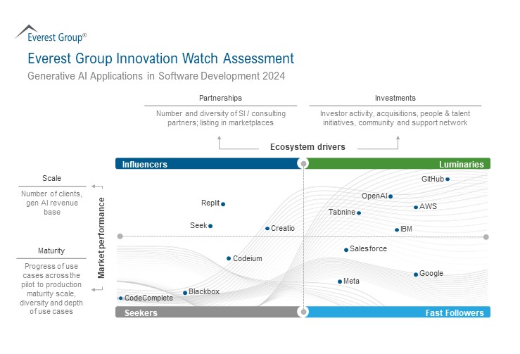 This report assesses 14 providers that offer gen AI solutions to address software development use cases, positioning them on Everest Group Innovation Watch Assessment as Luminaries, Fast Followers, Influencers, and Seekers.