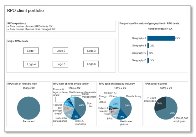 - RPO client portfolio: Includes major clients & recently announced contracts as well as RPO hires split by geography, industry, and buyer size