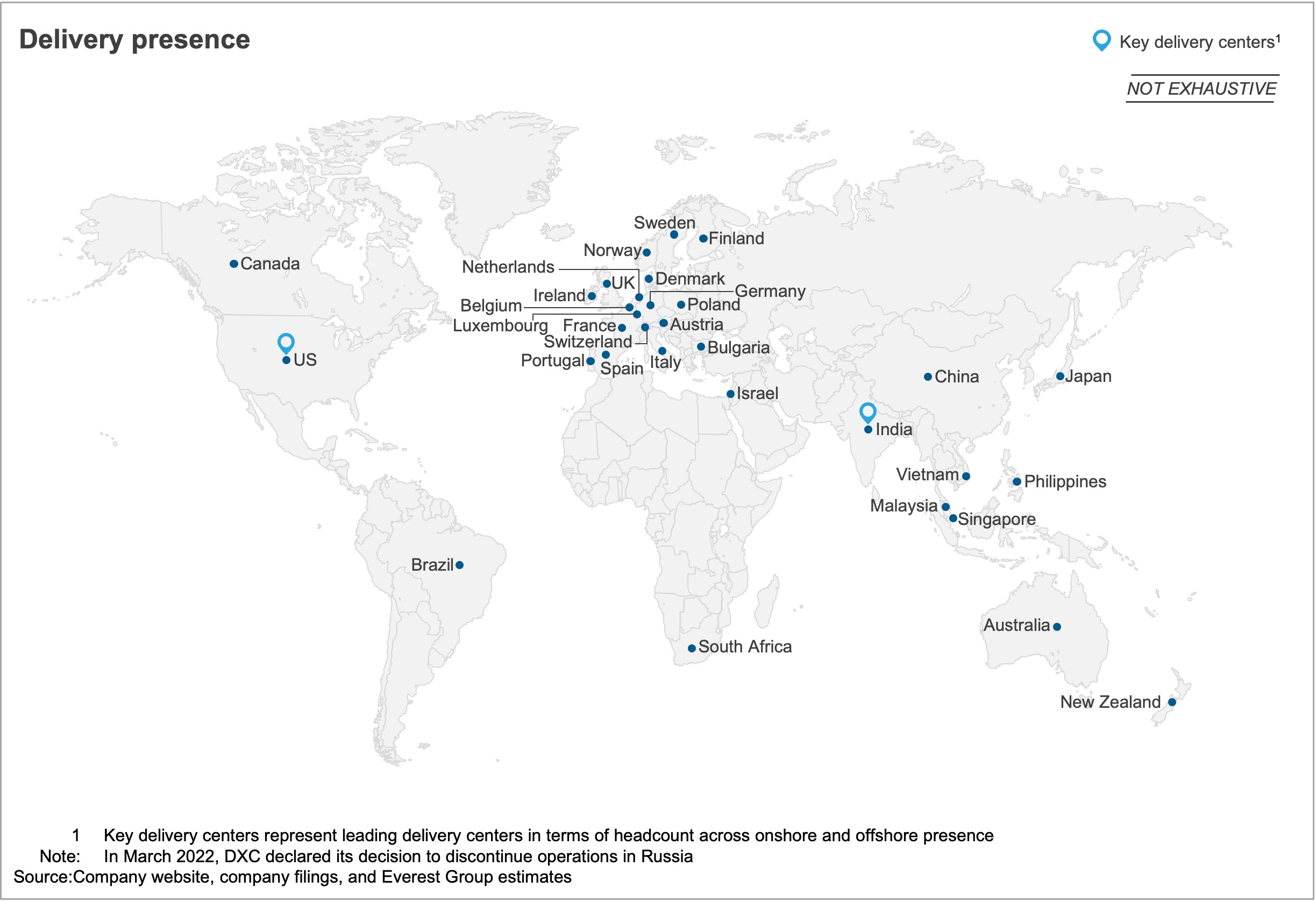 - Delivery footprint and headcount: graphical representation of the provider’s delivery presence and headcount across the globe