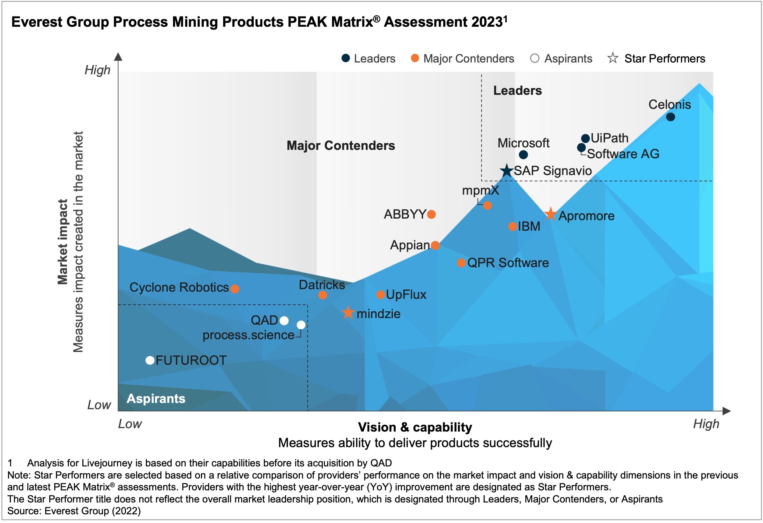 In this report, we examine 18 process mining technology providers and position them on Everest Group’s PEAK Matrix®, categorizing them as Leaders, Major Contenders, and Aspirants based on their capabilities and offerings. The research will help buyers select the right-fit technology providers for their needs and enable providers to benchmark themselves against the competition.