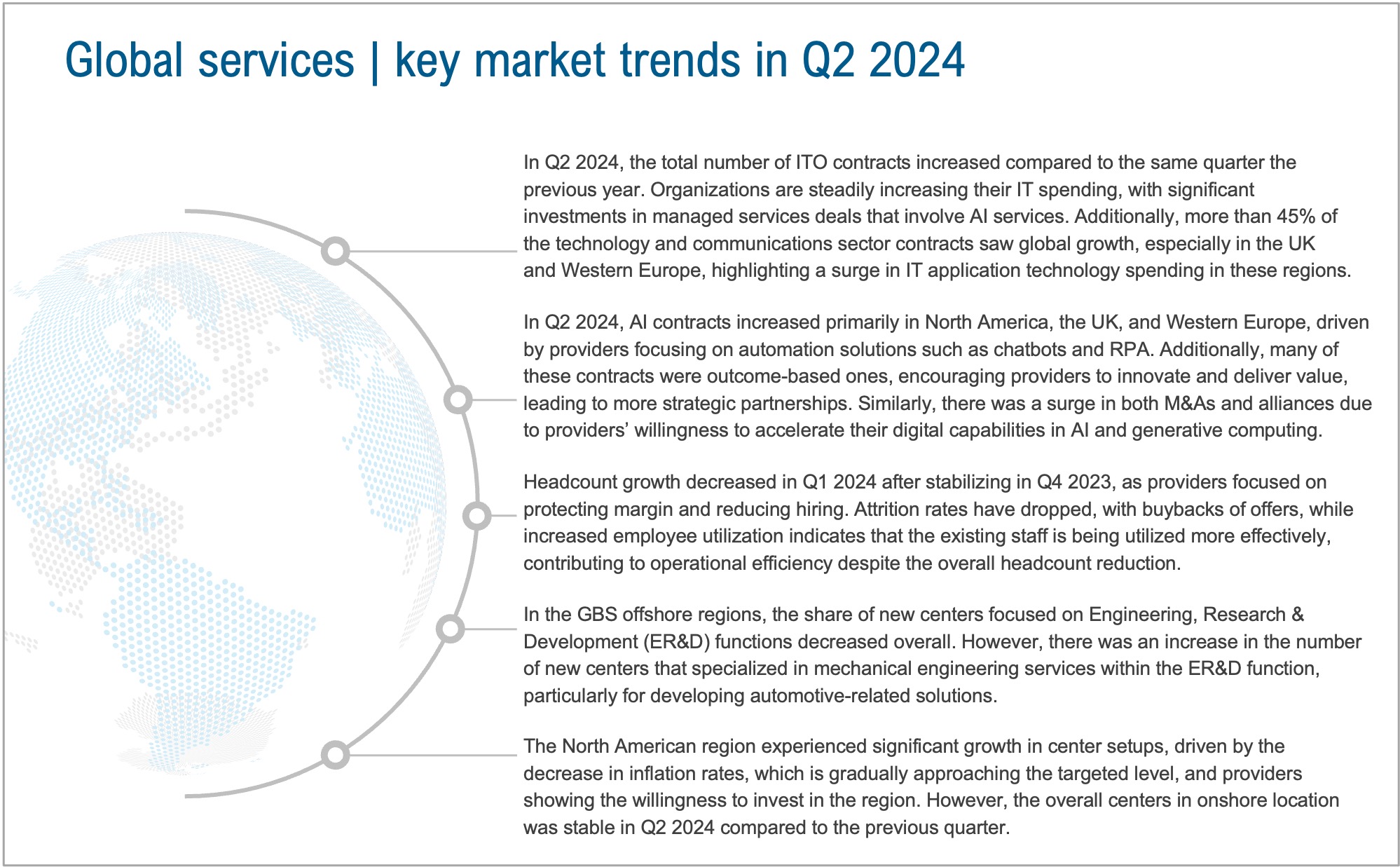 Market Vista™ Q3 2024 presents data, analysis, and insights on transaction trends, major outsourcing deals, provider developments, including the latest developments in next-generation technologies such as digital services, Global Business Services (GBS) market dynamics, and emerging trends in offshoring.