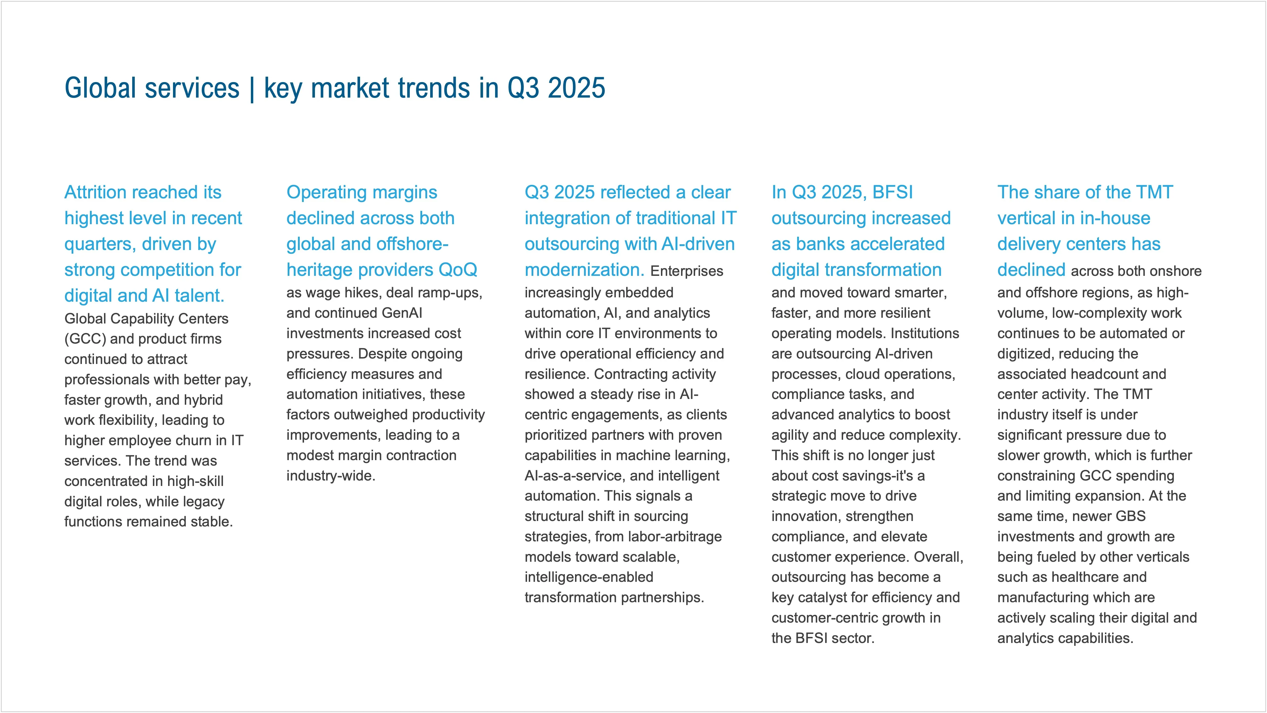 - Outsourcing and offshoring deal trends by function, geography, industry, and buyer type