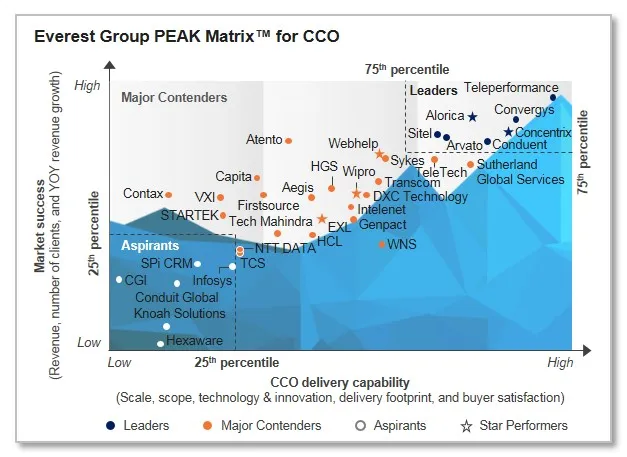 - Coverage across 35+ CCO service providers including Aegis, Alorica, Atento, Arvato, Capita, CGI, Concentrix, Conduent, Conduit Global, Contax, Convergys, DXC Technology, EXL, Firstsource, Genpact, HCL, Hexaware, HGS, Infosys, Intelenet, Knoah Solutions, NTT DATA, Sitel, SPi CRM, STARTEK, Sutherland Global Services, Sykes, TCS, Tech Mahindra, Teleperformance, TeleTech, Transcom, VXI, Webhelp, Wipro, and WNS