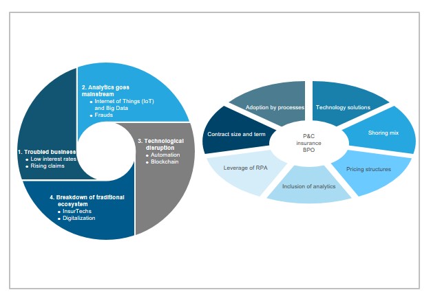 The continuum of challenges for the traditional P&C insurers is demanding them to revamp their strategy and operations. Challenges, such as pressures on profitability, tough macroeconomic conditions, competition from emerging digital players, fraud, and inefficient legacy technology infrastructure, are pushing them to develop non-traditional capabilities and optimize cost of insurance operations. This is driving the adoption of outsourcing in P&C insurance.