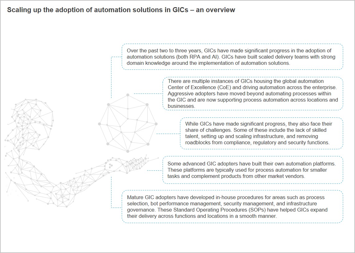 In the past 12-18 months, several GICs have steadily scaled up automation adoption and have started emerging as key strategic entities for enterprises. In fact, many GICs today house the global automation Center of Excellence (CoE), which drives several initiatives across the enterprise. Successful GICs have addressed challenges such as shortage of skilled automation talent, change management issues, and lack of leadership buy-in, and forged ahead in their journeys. Many GICs have also demonstrated they can generate revenue impact through automation initiatives.