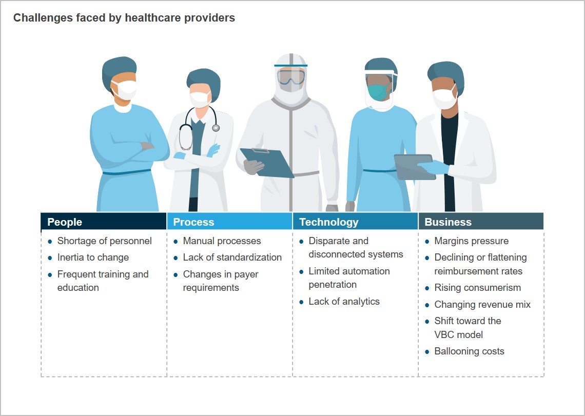 Healthcare providers in the US are severely challenged by administrative inefficiencies, evident from the fact that administrative expenses account for about 25% of their total spend on care. Additionally, COVID-19 has complicated matters for healthcare providers, especially with elective procedures being cancelled or rescheduled indefinitely, increasing the preparation cost for the pandemic and imposing a heavy burden on talent.