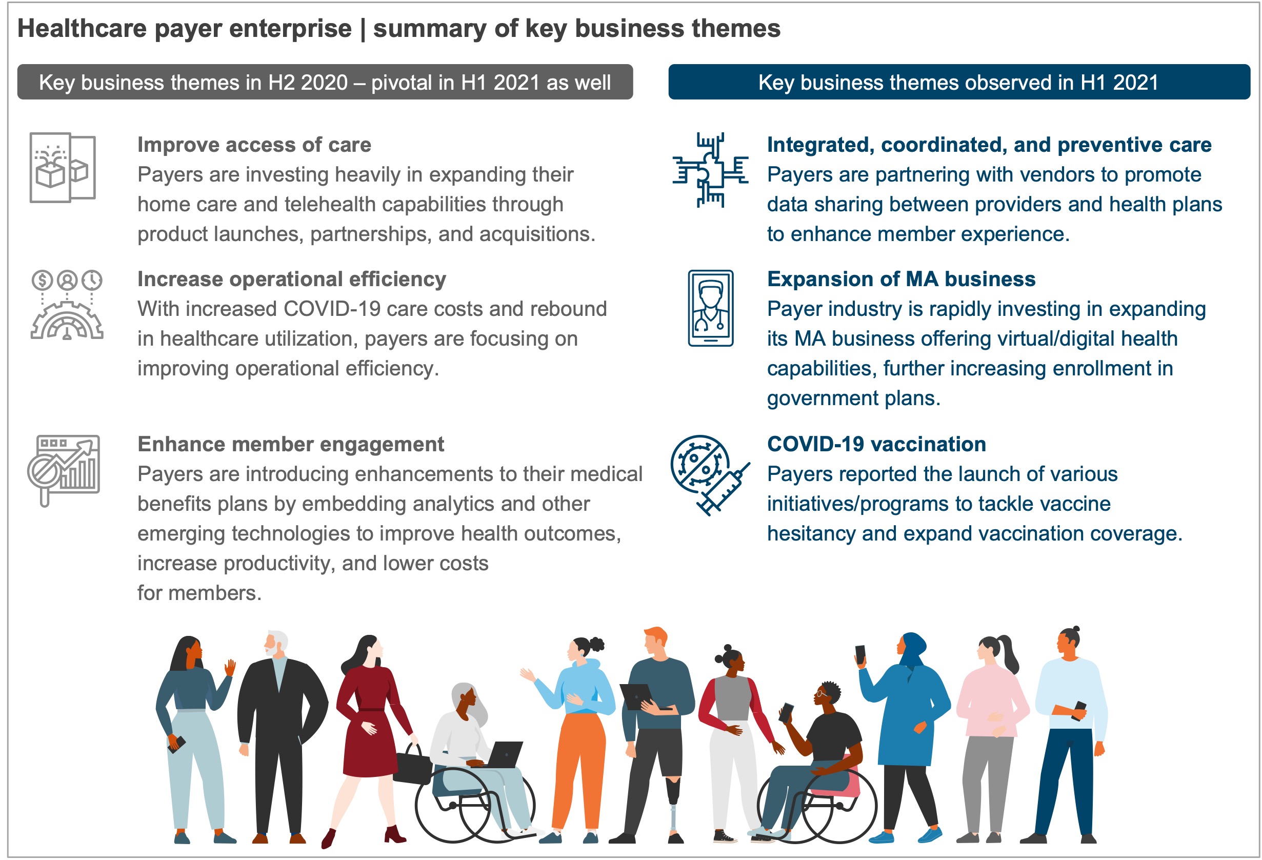 In fact, payers reported substantial profits in Q1 2021. Higher enrollment in government plans drove growth, especially for Medicare Advantage (MA) plans, though commercial enrollment was still below pre-pandemic levels. Healthcare enterprises are realizing the need to build coordinated, integrated, and preventive care as they shift to value-based care and look to bring down costs while improving the quality of care. Payers are increasingly developing strategies to build new home-based health models, strengthen population health initiatives, and facilitate better coordination between different forms of care.